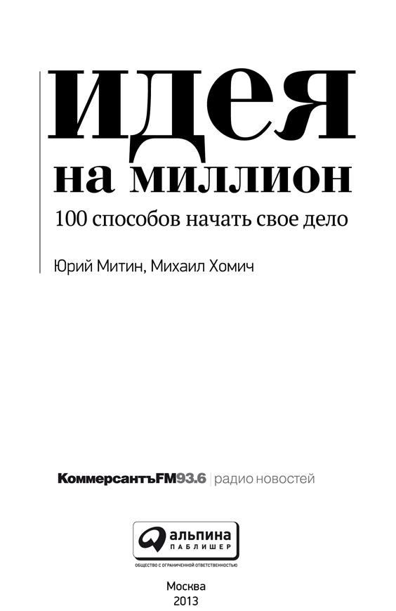 Идея на миллион: 100 способов начать свое дело / Юрий Митин, Михаил Хомич. — М.: Альпина Паблишер, 2013.