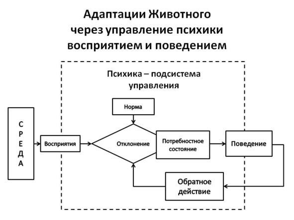 И восприятием, и поведением управляет психика. По типу восприятия среды в сопоставлении с памятью психика определяет (вычисляет) появление состояния утраты адаптации. Она запускает состояние внутреннего напряжения, мобилизует сначала саму психику как подсистему, а потом через команды организму и сам организм — вызывает его направленное восприятие (внимание) и заданное (с учетом опыта и даже при отсутствии опыта, то есть врожденное) поведение.