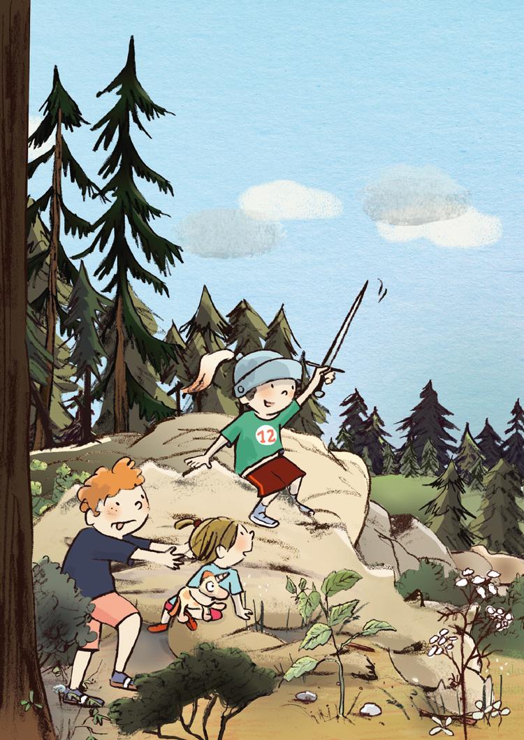 И я помог ей и Пони вскарабкаться на камни. И мы все уселись на самом верху. И вот уже трое наездников, сидя верхом на мшисто-зелёной спине чудовища, летят навстречу небу.