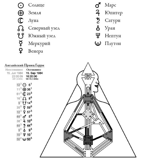 Дизайн Человека рассматривает 13 разных Влияний, зависящих от точного положения небесных тел в момент рождения. Место, занимаемое небесными телами в нейтринном потоке, устанавливает, какие Ворота будут активизированы и какие Центры будут определены. На Карте жизни эти небесные тела показаны специальными символами, рядом с черными или розовыми номерами Ворот. Подробности их влияния и значения разбираются на более высоком уровне Дизайна Человека, чем рассматривает эта книга. Но чтобы вы поняли, что вы видите в верхнем левом углу Карты, я предлагаю рассмотреть пример (см. цветную вклейку).