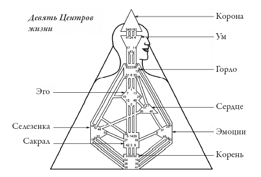 Я часто советую людям представить свой Дизайн как затейливое драгоценное украшение. Ювелирное изделие тончайшей и совершенной работы, сотворенное самой Вселенной. Каждый из нас несет в себе девять сверкающих жемчужин, которые на Карте жизни показаны квадратами, ромбами или треугольниками. Это девять Центров, формирующих основу нашего Дизайна. Они называются Корона, Ум, Горло, Эго, Сердце, Сакрал, Эмоции, Селезенка и Корень. Эти сияющие камни встроены в систему из 36 узких Каналов. На концах этих Каналов указаны номера, обозначающие 64 Ворот, которые определяют форму и контуры этой драгоценности.