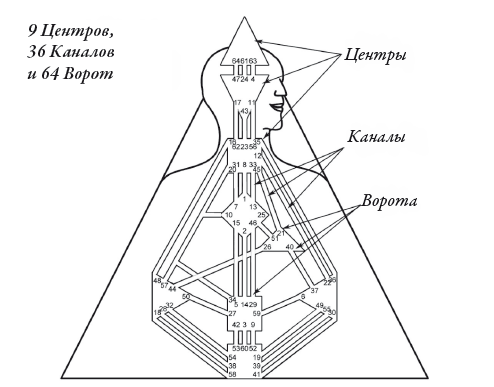 Чакры связаны посредством 36 Каналов, через которые постоянно течет поток энергии. Каналы формируют и изменяют энергию, придавая ей более определенные качества, характеристики и возможности. На концах каждого Канала стоят номера 64 Ворот. Такова схема ДНК нашей истинной природы, сформированной потоком нейтрино. Каждый человек имеет одни и те же 64 Ворота в одних и тех же местах. Но некоторые Ворота открыты, а некоторые закрыты, что придает Дизайну черты индивидуальности.