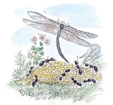 Осенью у муравьёв подмокла пшеница; они её сушили. Голодная стрекоза попросила у них корму. Муравьи сказали: