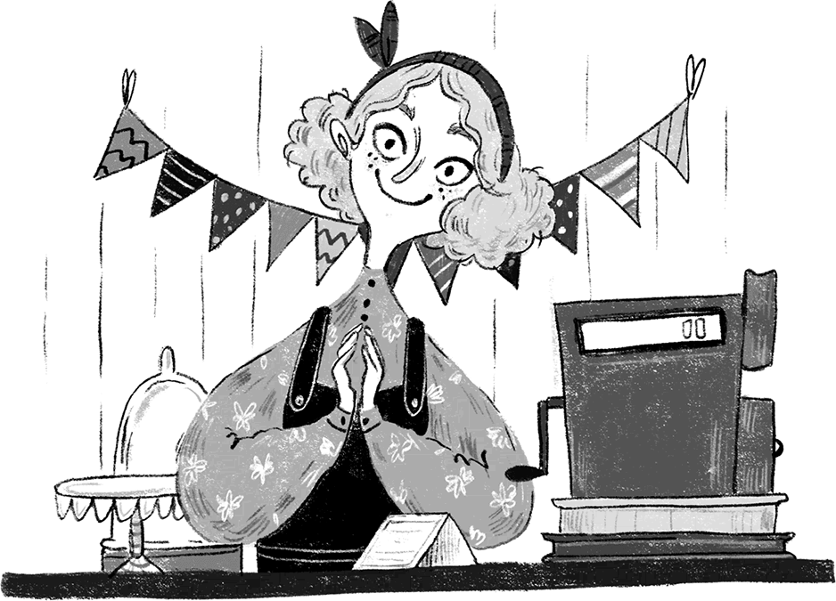 Девочка сразу же увидела, что эта кондитерская отличается от остальных. В других кондитерских подносы ломились от румяных пончиков, трубочек с кремом и рассыпчатого печенья. Кондитеры выставляли эти подносы на самое видное место в надежде заманить покупателей. Но у Корицы не было ни одного – даже самого крошечного! – подноса со сладостями. На абсолютно пустом прилавке стояла табличка, сделанная из бумаги аппетитно-розового цвета. Чья-то рука вывела на ней ярко-зеленую надпись. Но с улицы Марте не удалось разобрать слова.