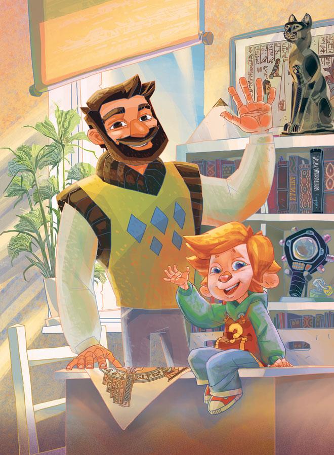 Здравствуйте, ребята! Меня зовут Чевостик. Я живу на книжной полке в библиотеке у дяди Кузи. Не удивляйтесь, я небольшого роста, а нижняя полка в книжном шкафу дяди Кузи очень высокая и просторная, поэтому мне на ней хорошо и удобно. Какой я? Похож на обыкновенного мальчишку, волосы рыжие, характер весёлый. Дядя Кузя в шутку зовёт меня Чевочка с хвостиком. Но никакого хвоста у меня нет, зато есть ушки на макушке. Больше всего на свете я люблю узнавать новое, поэтому всё время задаю всякие вопросы дяде Кузе. О чём бы я ни спросил, он всё знает и мне рассказывает. Это потому, что дядя Кузя очень умный. Он прочитал много-много разных книг. А ещё мы с ним любим путешествовать! В путешествиях нам помогает времяскок. Это такой прибор, его дядя Кузя изобрёл. Набираешь на времяскоке место и время, куда хочешь попасть, раз, два — и уже там! Сегодня мы наверняка тоже куда-нибудь отправимся!