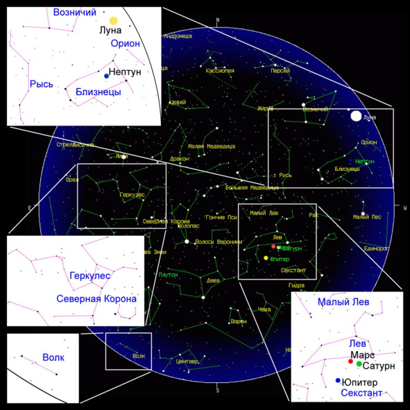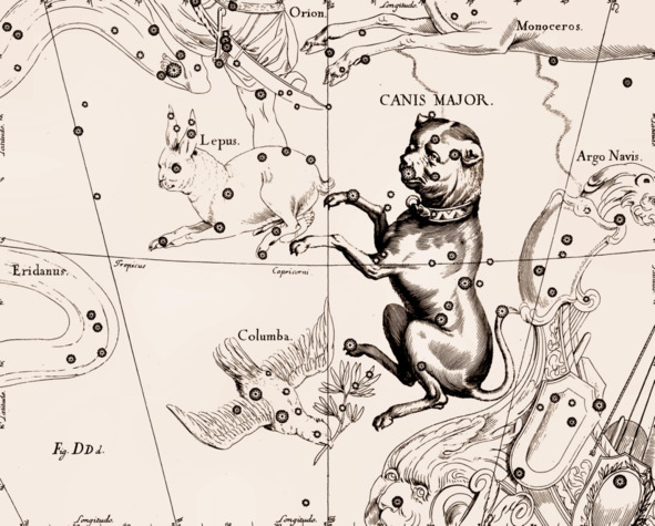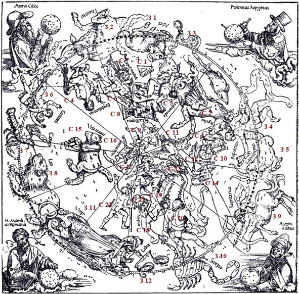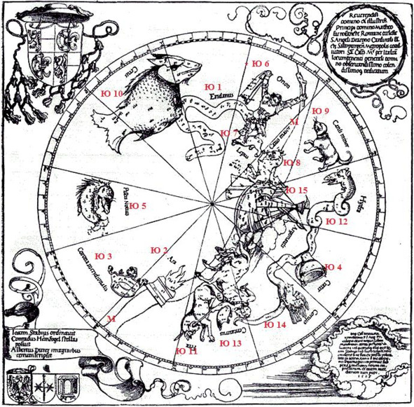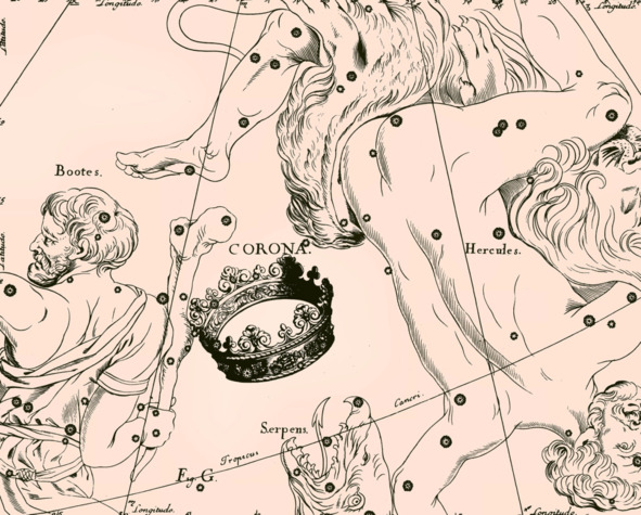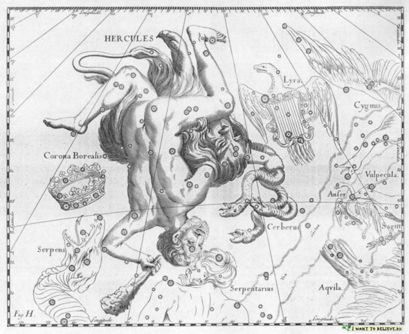 Созвездие Геркулес двинулось по звёздному небу. Поэт, устроившись у него за спиной в виде созвездия Северная Корона, двинулся за ним. Начиная с этого момента, путники в образе созвездий Геркулеса и Северной Короны не оставались на месте, а начали умозрительно обходить всю Сферу звёзд, двигаясь по ломаной линии, проходящей через все созвездия. Так последуем за ними и мы, пользуясь «Звёздным Атласом» Яна Гевелия и сверяясь с описанием созвездий у Арата Солийского и других астрономов. Путь их лежал на восток — против движения небесной Сферы.