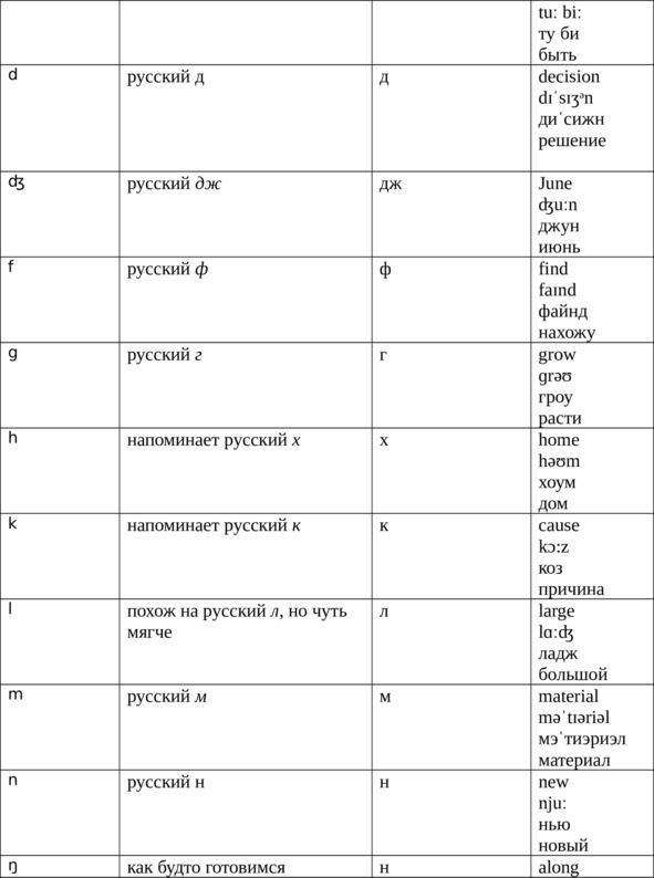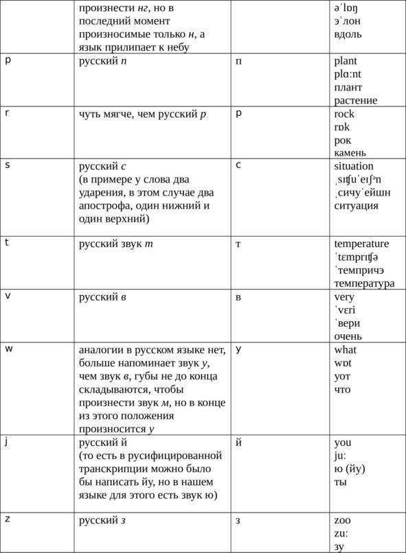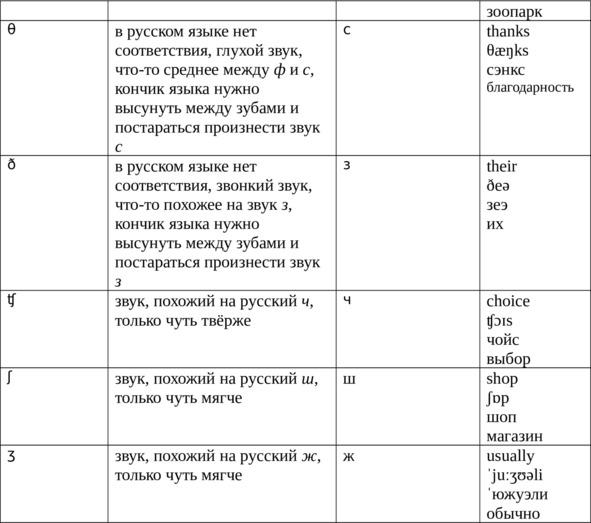 В английском языке бывают двойные гласные звуки дифтонги, которые в некоторых случаях произносятся не так, как отдельные гласные, их составляющие. Такие нестандартно произносимые дифтонги приведены в нижеследующей таблице, объясняющей произношение английских звуков. В этой таблице также приведена русифицированная транскрипция и даны примеры использования транскрипции в четвертом столбце — именно так будет и в тексте данной книги, посвященном деловому и повседневному общению. Сначала будет английский абзац, затем английская транскрипция, потом русифицированная транскрипция и перевод на русский язык.
