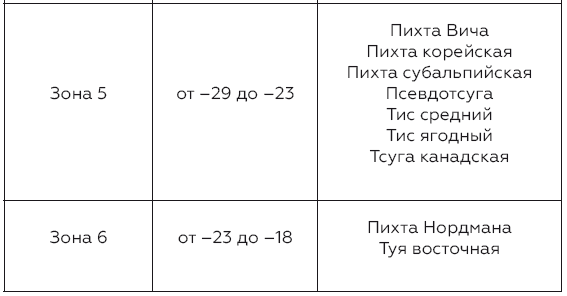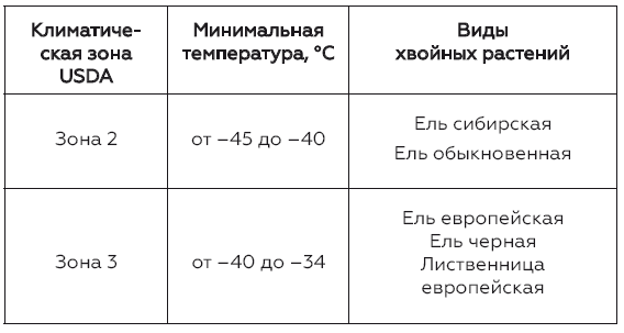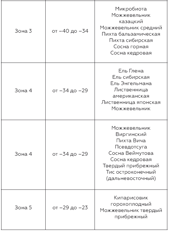 Для удобства я также добавила в эту таблицу самые распространенные виды хвойных растений в различных зонах.