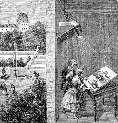 Прибор окружен занавесом из плотного сукна для полной световой изоляции. Изображение предмета получается уменьшенное, но сохраняющее все его цветовые оттенки и тончайшие очертания.