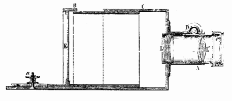 Описанная нами камера-обскура, употребляемая для светописи, имеет и другой вариант устройства корпуса, предложенный французским оптиком Дерожи. Вместо двигающихся один в другом ящиков корпус этой камеры-обскуры устроен наподобие гармони или раздувательных мехов. Такой корпус имеет с одной стороны доску, в которую вставлена трубка объектива, а с другой — раму с матовым стеклом. Корпус этот движется взад и вперед по рейкам и в случае надобности может быть укреплен неподвижно при помощи особых винтов.