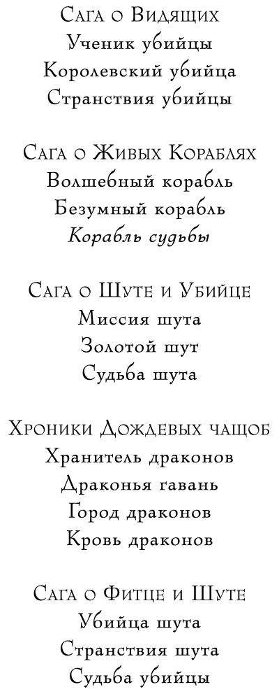 Корабль судьбы : роман / Робин Хобб ; пер. с англ. М. Семёновой. — СПб. : Азбука, Азбука-Аттикус, 2017. (Звезды новой фэнтези).