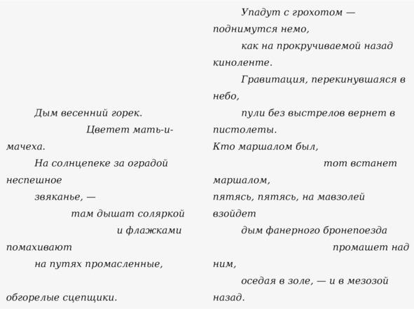 «бродский» показной цинизм: «Так, женская нога — всего лишь снятый / с нее чулок — и ничего нет под чулком»; иногда — прямо-таки интонационные цитаты из тогда еще живого и неканонизированного классика «Нет, в наше время папироса значит больше, / чем насыщенье этой папиросой».