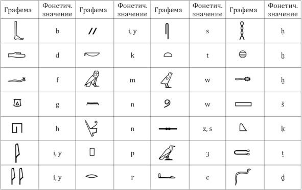 Таблица 1. Одноконсонантные египетские иероглифы.