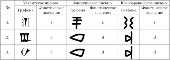 Предположим, что одна из этих вышеперечисленных систем письма и является прототипом для всех остальных. Но какая? Если судить по датировке, то ею, скорее всего, должна бы быть протосинайская. Бирюзовые рудники, где были обнаружены фрагменты этого письма, эксплуатировались лишь трижды: в XVIII, XVII–XVI и XV веках до н. э. Соответственно, к какой-то из этих дат и следует приурочить их нанесение. Самые ранние из протоханаанских надписей датируют XVI веком до н. э., а угаритских — XV веком до н. э. Старейшую финикийскую граффити на гробнице царя Ахирама относят к 1000 году до н. э. (есть и другие версии датировки), несколько моложе южноаравийское письмо. Однако в ситуации, когда каждая новая находка может существенно «состарить» любую из этих систем, датировка уже не может играть решающей роли. Обращение к письменным источникам также особых результатов не дает. Древние авторы отдают первенство в изобретении буквенно-звукового письма то египтянам (протосинайское или протоханаанское письмо, как переходная форма), то финикийцам, то сирийцам (Угарит — сирийский город). Здесь мы имеем прочный паритет. Правда из гонки отсеивается явный аутсайдер — южноаравийский алфавит. Но какой из оставшихся четырех появился раньше остальных? Небольшая зацепка появляется при сравнении графической формы знаков. Из табл. 2 хорошо заметно, что символы для звука s финикийской, угаритской и южноаравийской письменностей имеют общее происхождение. Но самое интересное здесь то, что без угаритской графемы оно никак бы не просматривалось! И, следовательно, первоисточником в этой тройке может быть только она! Другой пример, не менее красноречивый — знаки для звука d. Если посмотреть на вторую графу, то вроде бы особого родства не видно. Но заменив угаритский делет на знак для d (третья графа), мы заметим, что оно становится достаточно явным. И это находит вполне естественное объяснение из истории развития угаритской фонетической системы, в которой интердентальный d в отличие от других семитских языков переходит в зубной d.
