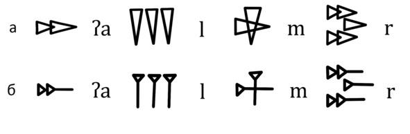 На рис. 1а видно, как могла выглядеть такая зарисовка. Клинья, выдавленные стилосом в глине, здесь заменили, похожие на них, элементы типа клинообразный треугольник (КоТ). Такая схематизация принята в среде ученых, занимающихся древней письменностью. Однако в наше время чаще стали применять другой элемент, возникший на основе КоТ. Назовем его: гвоздь с треугольной шляпкой (ГТШ). Как выглядят знаки угаритского письма, изображенные с помощью ГТШ можно увидеть на рис. 1б.