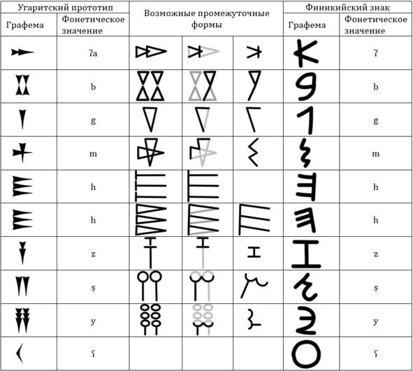 Дешифрованные системы буквенно-звукового письма: финикийская, южноаравийская и угаритская, имеют очень существенные различия. Однако некоторая часть знаков в них очень близка по внешнему виду и, что особенно важно — по фонетическому значению. Все они используют одинаковый консонантно-звуковой принцип, заключающийся в том, что в них используются знаки в основном для согласных и полугласных звуков (таких, как русское й). Поверить в то, что все они возникли самостоятельно и независимо друг от друга довольно сложно, и мысль о происхождении их от одного общего предка кажется наиболее правдоподобной.