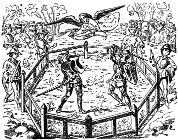 «Западный Смитфилд раньше назывался Рафиан-Холл, там обычно и встречались подобные типы, – рассказывает Фуллер[32], – случайно или нарочно, чтобы померяться силами в управлении мечом и щитом; чаще дело кончалось испугом, чем раной, и раной, чем убийством, но вместе с тем считалось недостойным мужчины бить под колено или острием. Однако с тех пор, как этот отъявленный изменник Роуленд Йорк впервые применил уколы рапирой, мечи и щиты вышли из употребления».