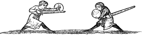 Рис. 7. Бой на мечах и щитах. Из рукописи в Королевской библиотеке