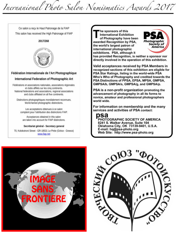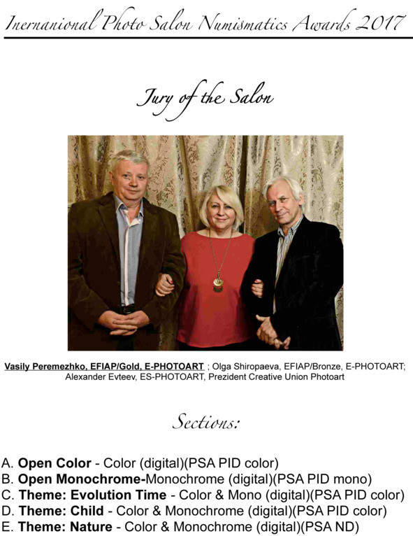 FIAP, предоставляя международной выставке свой патронаж, выдвигает требования к составу жюри. Во превых членов жюри должно быть четное количество: три или пять. Организатор фтотсалона и лица имеющие доступ к присланным на конкурс фотографиям не могут входить в состав жюри. И еще одно требование: хотя бы один из членов жюри должен иметь одно из званий FIAP. В состав жюри Numismatics Awards 2017, входил, безвременно ушедший от нас Василий Перемежко, обладатель наивысшего в России фиаповского звания FIAP/Gold. Председатель жюри Александр Евтеев, Президент Творческого Союза Фотоискусство. Третий член жюри — Ольга Широпаева, обладатель звания EFIAP/Bronze.