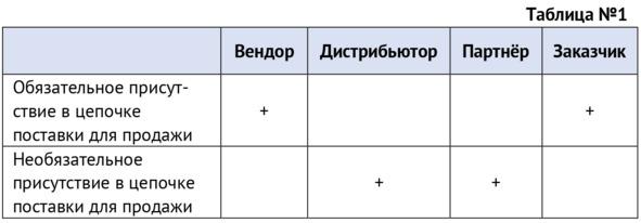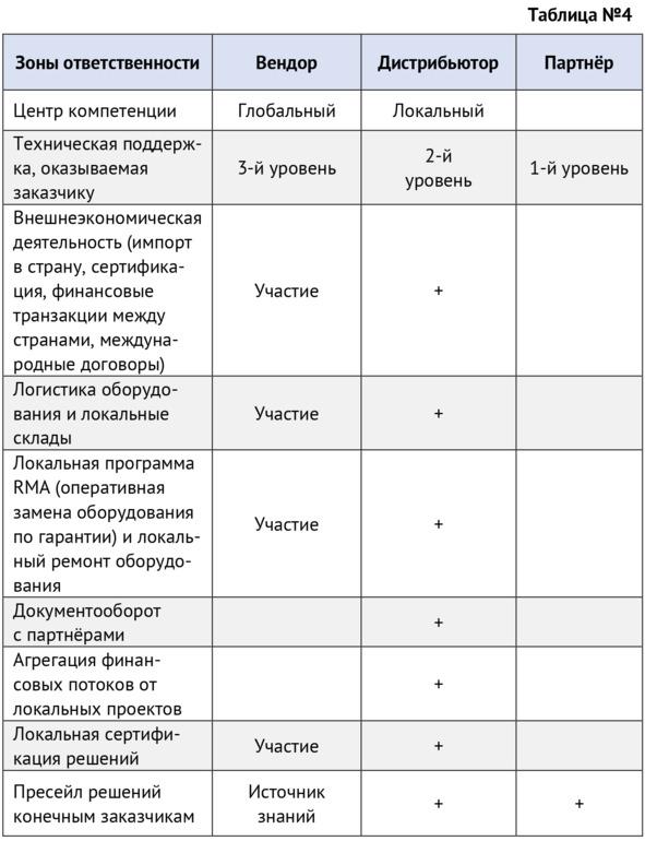 В совместном бизнесе вендоров, дистрибьюторов и партнёров зоны ответственности могут быть распределены по-разному (см. таблицу №3).