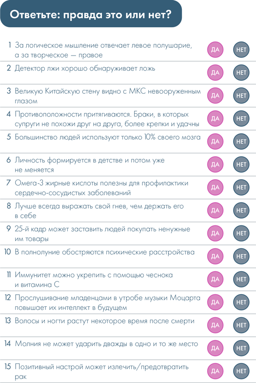 То есть каждое из предложенных утверждений ложно. Удивлены? «Да не может быть!», «Это бред!», «Какая-то провокация!», «Я точно об этом где-то читал или слышал!» — скажете вы. Да, я, конечно, понимаю, что некоторые из вас возмущаются и негодуют. Но совсем скоро вы узнаете, что каждое из утверждений, предложенных в опроснике, — миф и стереотип, и я это докажу с помощью данных научных исследований.