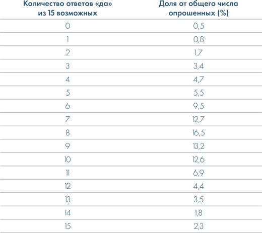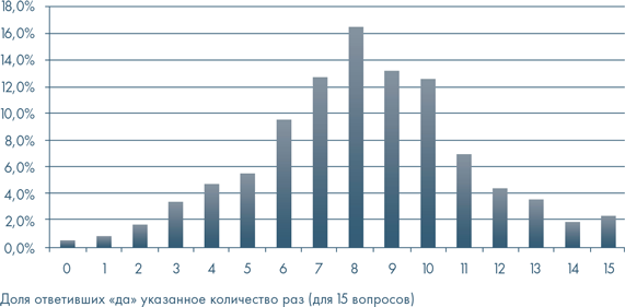 Но вначале давайте посмотрим, как отвечают на эти вопросы другие люди. Одна из моих компаний — исследовательская лаборатория Business Speech Science Research (BSSR)1 — занимается научными исследованиями в области социальной коммуникации. Перед выпуском книги мы предложили самым разным людям ответить на те же вопросы, которые задавались вам. Исследование можно считать репрезентативным, ведь мы опросили 1000 человек разного возраста, социального статуса, из различных сфер деятельности и разных городов. Оказалось, что в среднем люди соглашаются с 7 утверждениями из 15 предложенных. Более детальное распределение ответов можно увидеть на диаграмме:
