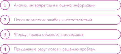 В итоге получаем следующее определение такого сложного явления, как критическое мышление. Критическое мышление — это способ мышления, позволяющий анализировать поступающую информацию и ставить ее под сомнение, формулировать обоснованные выводы, давать собственную оценку происходящего, а также принимать решения в условиях неопределенности.