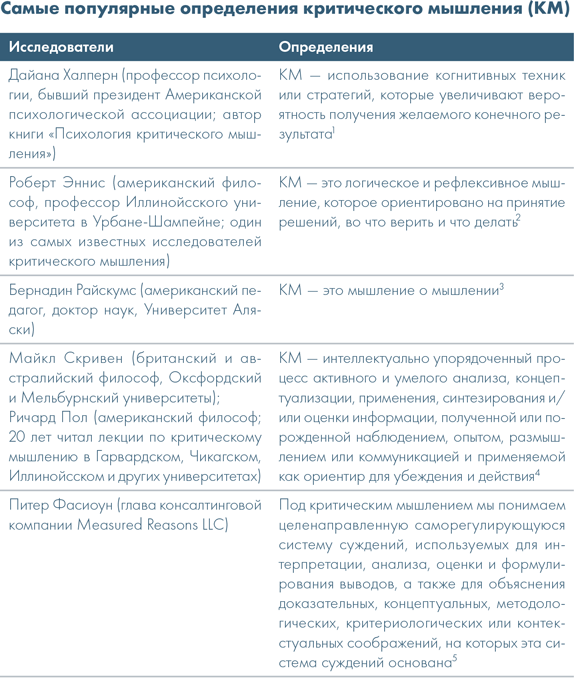 Справедливости ради стоит отметить, что мое определение критического мышления (КМ) значительно отличается от тех, что вы можете прочитать в других авторитетных книгах. Это вовсе не означает, что есть «правильное» или «неправильное» определение, — есть просто разные трактовки понятия. Критическое мышление как область научного познания еще относительно новая дисциплина, поэтому неудивительно, что взгляды исследователей на нее будут меняться и неоднократно пересматриваться. Давайте познакомимся с другими определениями КМ, чтобы сформировать для себя полную картину.
