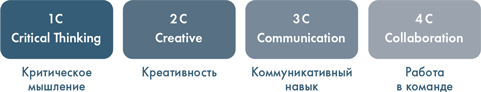 Или давайте возьмем американскую концепцию 4Сs. В 2002 году в Америке было создано Партнерство для изучения навыков XXI века41, куда вошли представители Департамента Министерства образования США, Национальной ассоциации образования (NEA), других государственных и некоммерческих организаций и даже нескольких компаний, среди которых Microsoft, Apple, Cisco и Dell. Сообщество провело анализ и выявило четыре ключевых навыка, в первую очередь необходимых для обучения в XXI веке. Думаю, вы догадываетесь, что среди них, конечно, есть критическое мышление. Давайте посмотрим на остальные: