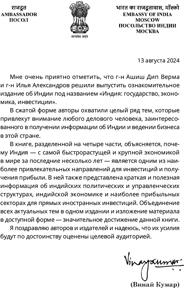 От души приветствую всех, кто интересуется Индией, и желаю вам, вдохновившись книгой, внести личный вклад в преобразование практических деловых отношений двух старых друзей в новую реальность между ними.