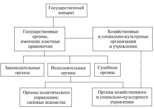 исполнительные органы (правительство, центральные ведомства, их подразделения на местах); при этом следует различать, с одной стороны, органы, выполняющие политические функции и включающие силовые ведомства, а с другой — органы социально-культурного управления;