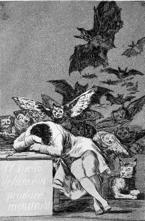 К 1797 г. относится создание офорта, на котором художник изобразил самого себя, сидящего, уронив голову на конторку и закрыв руками лицо. А вокруг носятся в воздухе отвратительные летучие мыши и совы… Иные из них уже вцепились в его спину когтями. Картина так и называется – «Сон разума рождает чудовищ».