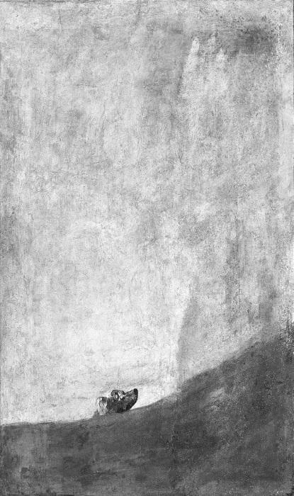На фотографии Ж. Лорана, сделанной ок. 1874 года, до переноса картины из «Дома Глухого», можно увидеть предположительно очертания скалы и птиц, на которых смотрит собака.