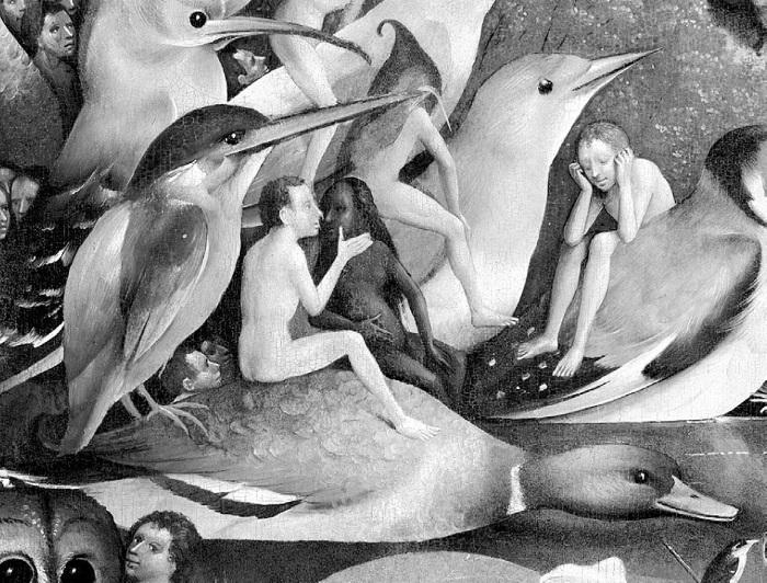 Возьмем одно из самых известных полотен Босха – «Сад земных наслаждений» (1510). На нем изображены гигантские птицы и чудовища, на фоне которых копошатся обнаженные люди. В клюве одной из птиц – большая кроваво-красная ягода.