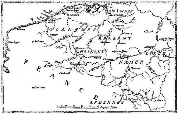 This is your first view of the little country called Belgium, which is bounded on the east by Holland, and on the west by France. It is, from end to end, about half the size of Ireland.