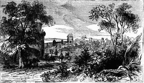 The wall extended across the island, from the mouth of the Tyne, on the German Ocean, to the Solway Frith—nearly seventy miles. It was twelve feet high, and eight feet wide. It was faced with substantial masonry on both sides, the intermediate space being likewise filled in with stone. When it crossed bays or morasses, piles were driven to serve as a foundation. Of course, such a wall as this, by itself, would be no defense. It was to be garrisoned by soldiers, being intended, in fact, only as a [page 30] means to enable a smaller number of troops than would otherwise be necessary to guard the line. For these soldiers there were built great fortresses at intervals along the wall, wherever a situation was found favorable for such structures. These were called stations. The stations were occupied by garrisons of troops, and small towns of artificers and laborers soon sprung up around them. Between the stations, at smaller intervals, were other smaller fortresses called castles, intended as places of defense, and rallying points in case of an attack, but not for garrisons of any considerable number of men. Then, between the castles, at smaller intervals still, were turrets, used as watch-towers and posts for sentinels. Thus the whole line of the wall was every where defended by armed men. The whole number thus employed in the defense of this extraordinary rampart was said to be ten thousand. There was a broad, deep, and continuous ditch on the northern side of the wall, to make the impediment still greater for the enemy, and a spacious and well-constructed military road on the southern side, on which troops, stores, wagons, and baggage of every kind could be readily transported along the line, from one end to the other.