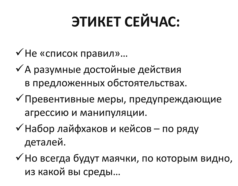 Что же сейчас, в XXI веке, скрывается под словом «этикет»? Да, собственно, то же, что и с сотворения мира. Этикет как система знаков и ритуалов проверен временем на эффективность! Конечно, ритуалы меняются – сама жизнь, технический прогресс, изменение в социальных ролях полов, даже появление удобной одежды влияют на «знаки вежливости». Уходят бессмысленные в новых обстоятельствах, появляются более актуальные. Но СУТЬ сохраняется! Для взаимодействия людей останутся важными знаки, которые выказывают доверие, позволяют быстро распознать своего/чужого, охраняют участников контакта от агрессии и делают приятным общение.