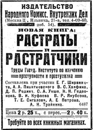 К вопросам борьбы с растратами обращались ученые-криминалисты Института. Так, П. Тарасов-Родионов и М. Ласкин отмечали14, что в делах о растратчиках-расхитителях большое значение должно уделяться профилактической работе следователя, исчерпывающему анализу системы работы, если не всего учреждения, то его части, где было совершено преступление — «без этого нельзя ни правильно оценить степень социальной опасности, ни наметить пути как к ликвидации последствий преступления в данной организации, так и к предотвращению возникновения подобных преступлений в других путем своевременной сигнализации соответствующим организациям о выявленных следствием общих недочетах»15.