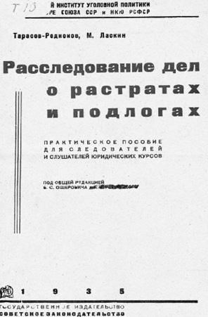 Тарасов-Родионов П., Ласкин М. Расследование дел о растратах иподлогах: практическое пособие для следователей и юридических курсов. М., 1935. 80 с.