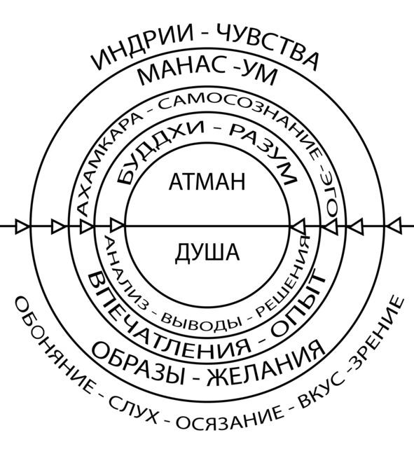 «Тело есть колесница, чувства — кони, ум — поводья. Буддхи (разум) выполняет функцию возничего. Хозяин этой колесницы — душа. Душа „тоньше“ чувств, ума, эго и разума. На практике чувства подчинены уму, ум подчинен эго, эго подчинёно разуму, а разум подчинён душе». «Это значит, что чувства приводятся в движение умом. Если остановить ум, то чувства не сработают. Подстёгиваемый эгоизмом, ум приходит в движение. Где нет эгоизма, там откуда взяться уму? Таким же образом, если душа будет сильной, если мы услышим её голос, то разум не получит превосходства. Это значит, что, если душа и разум действуют сообща, то первенство следует отдать душе, следует позволить ей двигаться вперёд, следовать ей, не обращая внимания на ум». («Голос Девраха Бабы», д-р Радхараман, Шри Дев Дас джи Махарадж, Шри Рам Севак джи Махарадж).