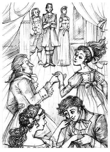 “Oh! my dear Mr. Bennet,” as she entered the room, “we have had a most delightful evening, a most excellent ball. I wish you had been there. Jane was so admired, nothing could be like it. Everybody said how well she looked; and Mr. Bingley thought her quite beautiful, and danced with her twice! Only think of that, my dear; he actually danced with her twice! and she was the only creature in the room that he asked a second time. First of all, he asked Miss Lucas. I was so vexed to see him stand up with her! But, however, he did not admire her at all; indeed, nobody can, you know; and he seemed quite struck with Jane as she was going down the dance. So he inquired who she was, and got introduced, and asked her for the two next. Then the two third he danced with Miss King, and the two fourth with Maria Lucas, and the two fifth with Jane again, and the two sixth with Lizzy, and the Boulanger-”