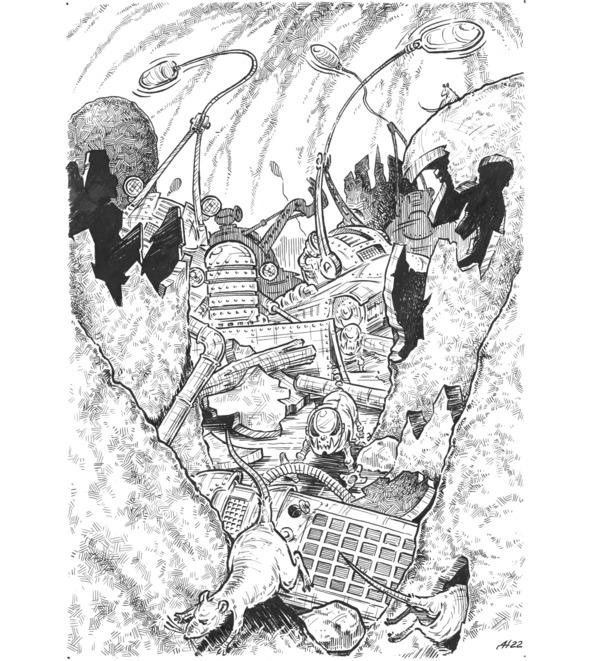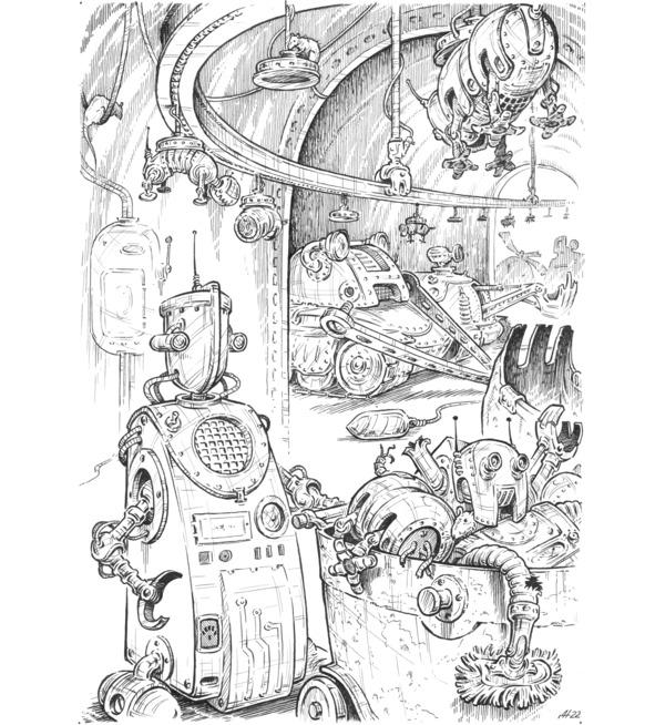 Крысы, селились в южной части. Когда-то эо жили там, но однажды ушли в Северный сектор. Мы прекрасно себя чувствовали в заброшенных домах, среди окаменевших кустов и в подземных каналах. Проблем с едой не было: в районе продолжала работу фабрика-автомат по переработке пищевых отходов. Что еще нужно для счастья? Но было в нашем районе то, что притягивало нас, будило фантазию и разжигало любопытство. Это завод по ремонту машин. Его тихое гудение сопровождало нашу жизнь с рождения. Каждый вечер перед воротами цеха зависали четырехмоторные аппараты — беспилотные коптеры. Они осторожно опускали на землю неподвижные, потерявшие способность работать машины.