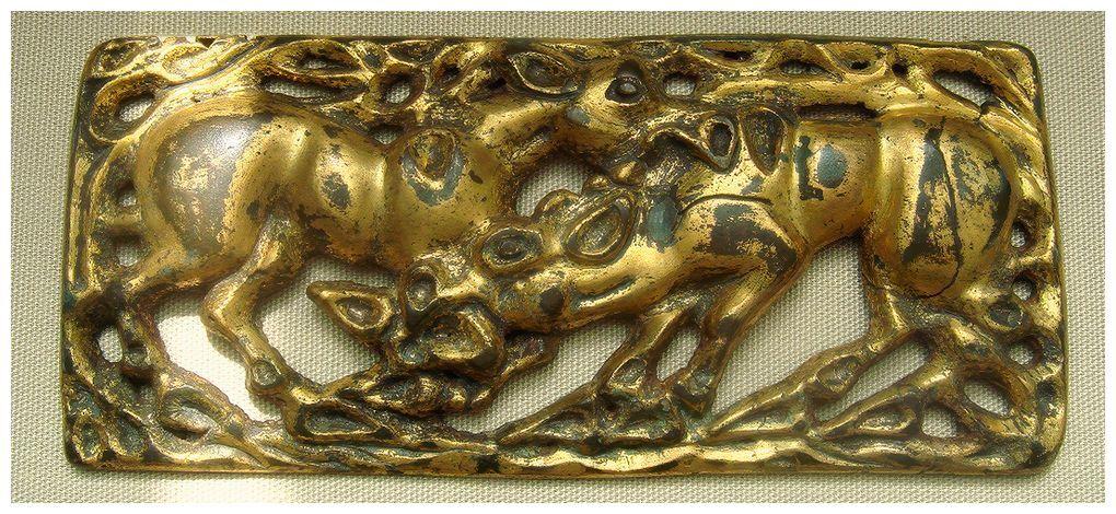 Исконно германский «звериный стиль» образовался на базе особой техники – насечки (вырезки), которая заключается в удалении мелких стружек с плоской поверхности. На первых порах становления стиля животные в композиции состояли из геометрических фигур, иногда распадающихся на элементы.