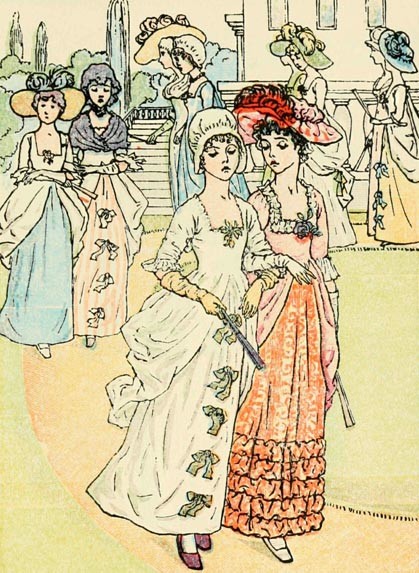 In a yellow petticoat and a green gown.