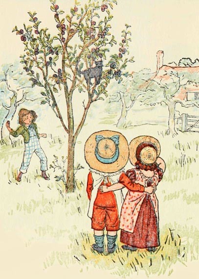 The cat ran up the plum tree,