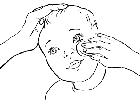 Если врач порекомендует массаж, он должен показать, как его делать. Толчкообразными движениями надавливайте подушечкой пальца в области слезного мешка (небольшого участка между внутренним уголком глаза и боковой поверхностью спинки носа) сверху вниз, строго в вертикальном направлении, 10–15 раз. Данную процедуру надо выполнять 3–5 раз в день. Цель массажа – разрыв желатинозной пробки. Если к 3–4 месяцам разрыва пленки не происходит, требуется операция под местной анестезией – зондирование слезно-носового канала.