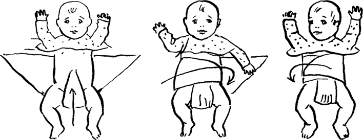 При пеленании не стягивайте ножки малыша и, прокладывая подгузник, оставляйте их слегка разведенными. Подобное широкое пеленание сохраняет правильное формирование тазобедренных суставов.