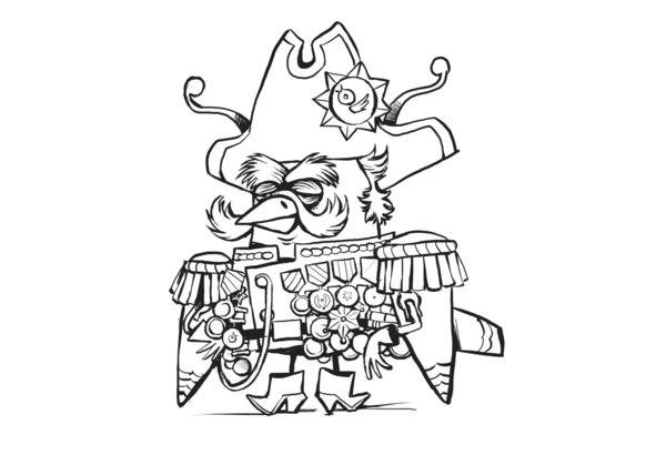 Сержант от крика тоже проснулся, но, поскольку уже стоял на ногах, то теперь только мудро щурил глаза и ответственно шевелил усами. Рядовой Ноплюх подошёл к сержанту и громко доложил, что подъём караула произведён. Внешне этот солдат был почти полной копией сержанта. Мундиры у них в любом случае были скроены одинаково. Правда, солдатам было не положено золотых пуговиц (те могли потеряться или оторваться в бою), а из всех орденов и медалей на груди рядового Ноплюха красовалась лишь криво пришитая заплата.
