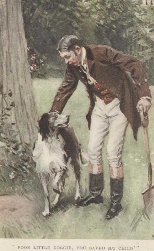 Soon the master stopped discussing a moment, and rang in the footman, and said, “Bury it in the far corner of the garden,” and then went on with the discussion, and I trotted after the footman, very happy and grateful, for I knew the puppy was out of its pain now, because it was asleep. We went far down the garden to the farthest end, where the children and the nurse and the puppy and I used to play in the summer in the shade of a great elm, and there the footman dug a hole, and I saw he was going to plant the puppy, and I was glad, because it would grow and come up a fine handsome dog, like Robin Adair, and be a beautiful surprise for the family when they came home; so I tried to help him dig, but my lame leg was no good, being stiff, you know, and you have to have two, or it is no use. When the footman had finished and covered little Robin up, he patted my head, and there were tears in his eyes, and he said: “Poor little doggie, you saved HIS child!”