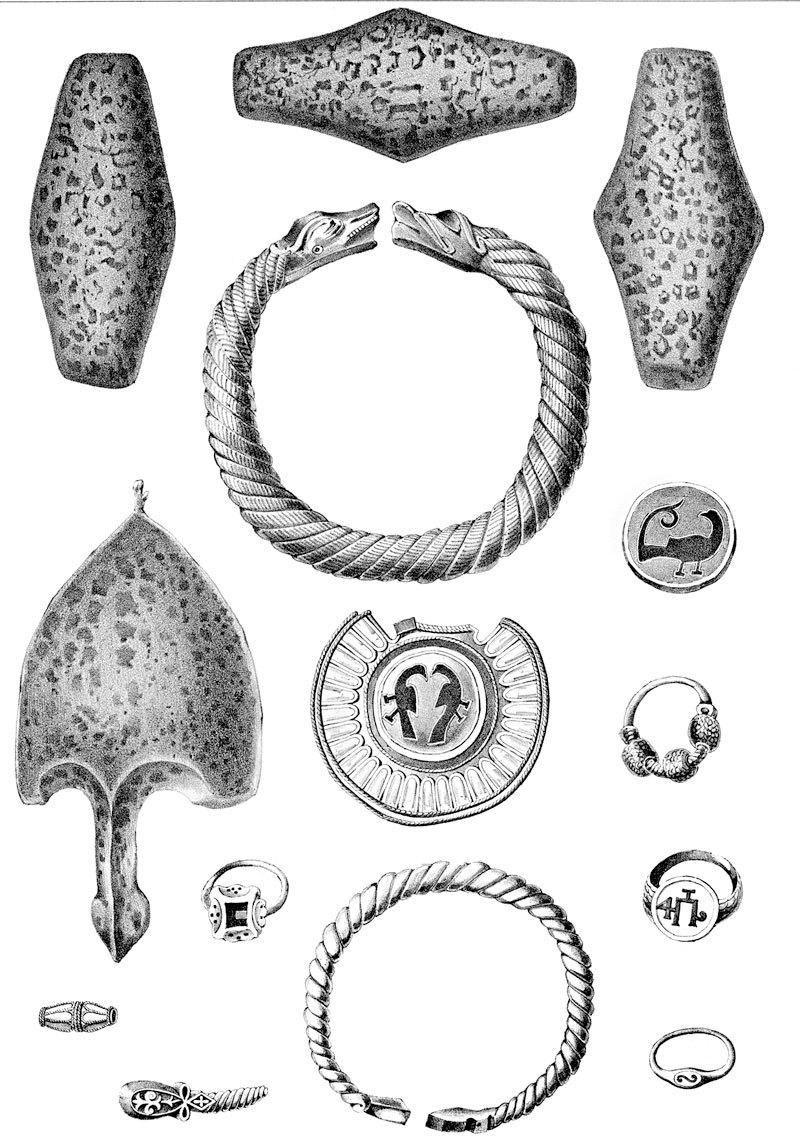 Археологические находки на территории древнего Киева: три киевские гривны серебра; варяжский шлем (шишак); большая серебряная серьга и кружок с птицей от той же серьги; серебряная серьга; золотые перстни; золотая запонка; большой плетеный золотой браслет; серебряный браслет с легендой. Гравюра из книги «Обозрение Киева в отношении к древностям» И. Фундуклея